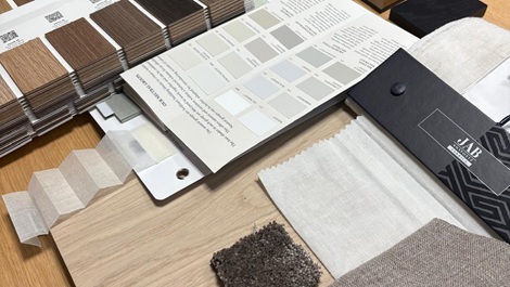 Material- und Farbkonzept für eine Wohnraumgestaltung in Gossau mit Textilien, Holzmustern und abgestimmten Farbpaletten